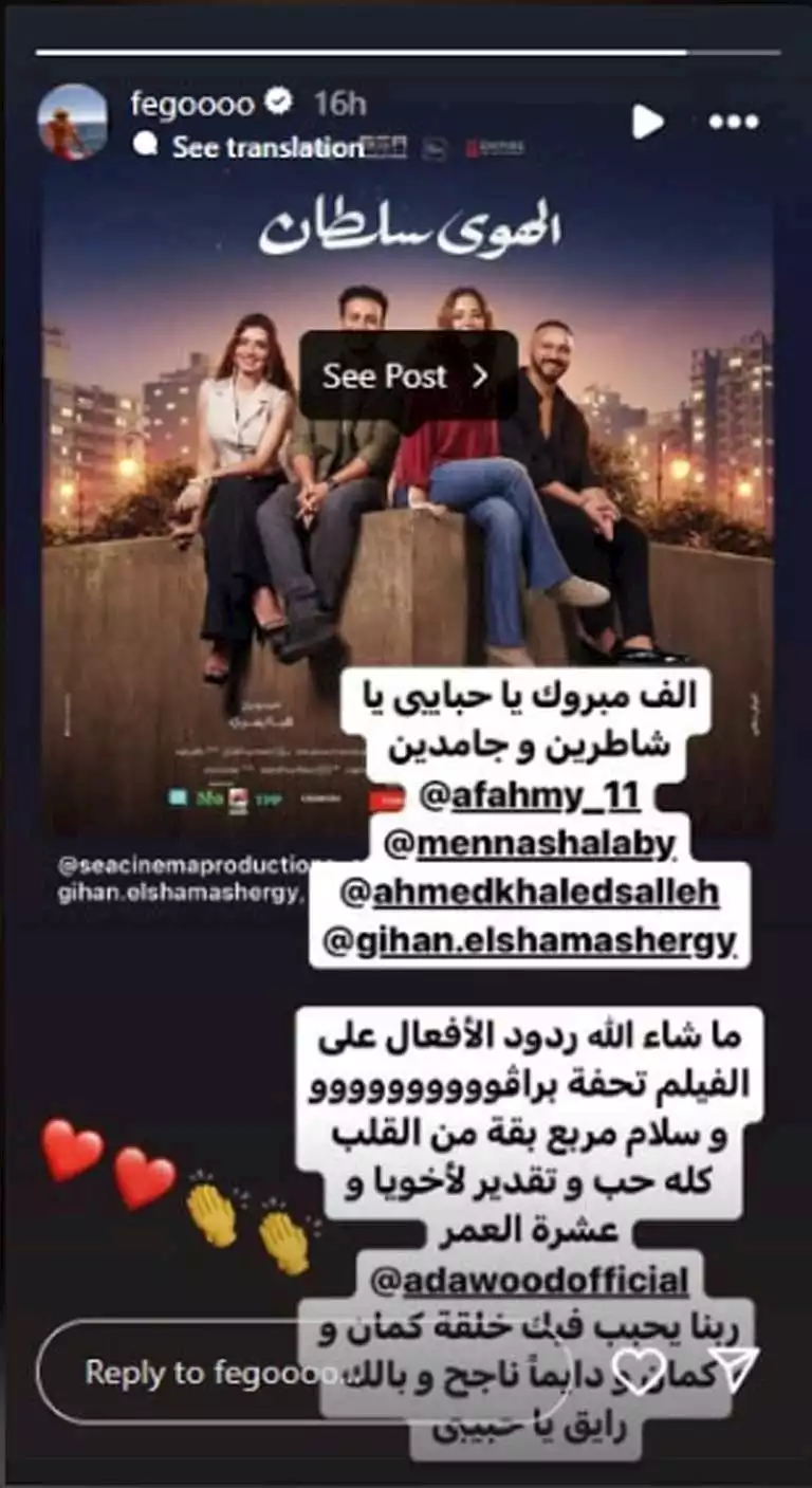محمد فراج يوجه رسالة تهنئة لأبطال فيلم "الهوى سلطان" بطولة منة شلبي