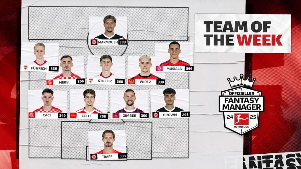 خط الوسط: جمال موسيالا (بايرن ميونخ)، فلوريان فيرتز (باير ليفركوزن)، أنجيلو ستيلر (شتوتجارت)، بول نيبل (ماينز)، كريس فوهريش (شتوتجارت).