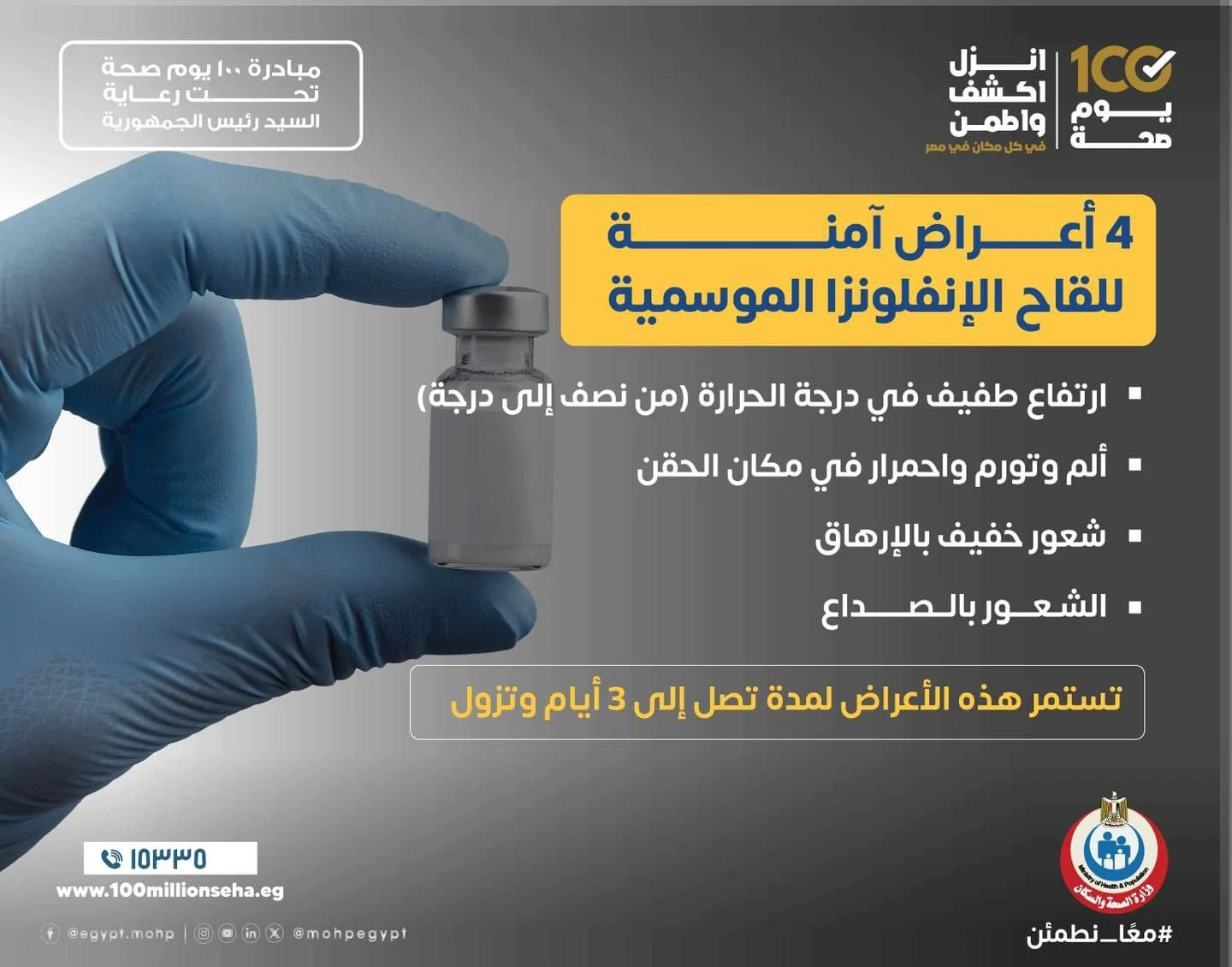 وتابعت وزارة الصحة والسكان: تستمر هذه الأعراض لمدة تصل إلى 3 أيام وتزول