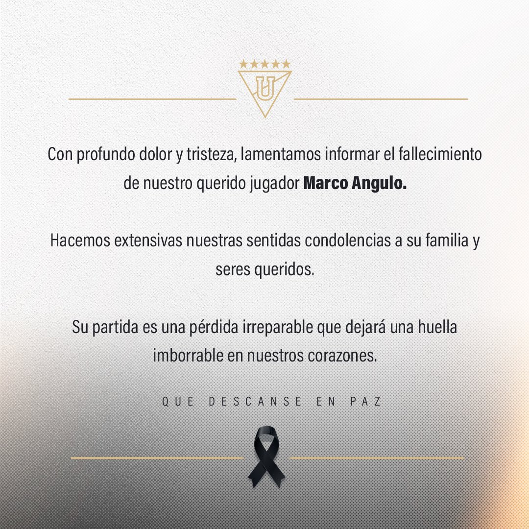 وقال نادي ليجا دي كيتو عبر حسابه الرسمي على موقع التواصل الاجتماعي "إكس": "ببالغ الحزن والأسف، ننعى رحيل لاعبنا ماركو أنجولو، مقدمين تعازينا الحارة ولعائلته ولأحبائه، إنها لخسارة كبيرة ألقت في قلوبنا حزن لا يطاق".
