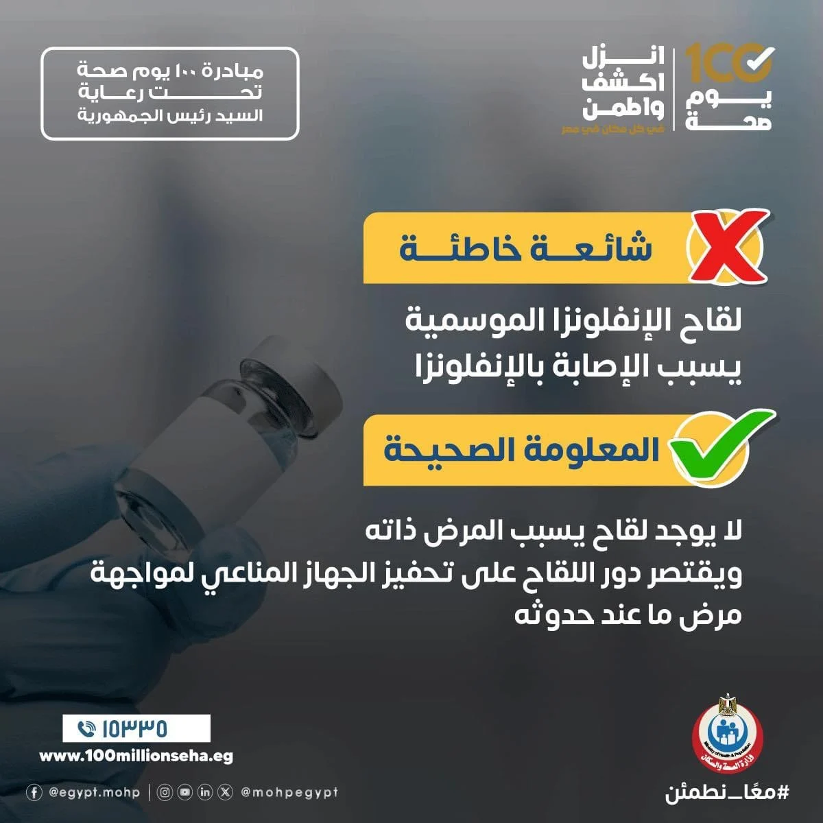 قالت وزارة الصحة والسكان، إن لقاح الإنفلونزا الموسمية لا يسبب الإصابة بالمرض، ولا يوجد لقاح يسبب المرض ذاته، ويقتصر دور اللقاح على تحفيز الجهاز المناعى لمواجهة مرض ما عند حدوثه.