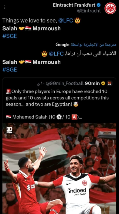 تغزل فريق آينتراخت فرانكفورت الألماني في الثنائي المصري مهاجمه عمر مرموش، ومحمد صلاح نجم ليفربول الإنجليزي، بعد تألقهما في الملاعب الأوروبية، خلال منافسات الدوري الإنجليزي والبوندزليجا.