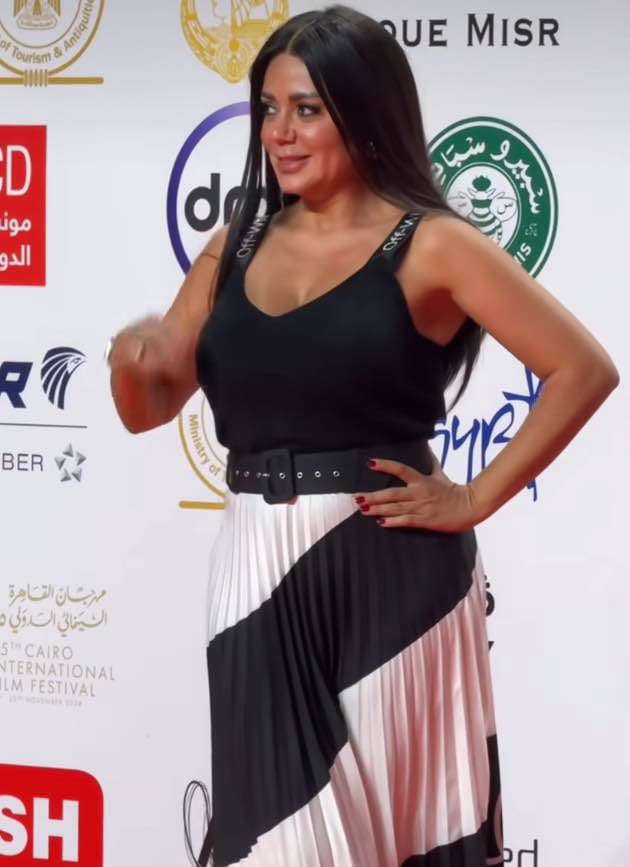 وظهرت رانيا يوسف بإطلالة جريئة ولافتة مرتدية توب أسود حمالات وجيب شيفون باللون الأبيض مع الأسود.