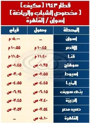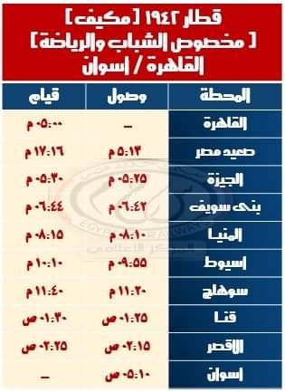 ويقوم القطار من القاهرة يوم الجمعة من كل أسبوع فى رحلة الذهاب على أن يعود من أسوان يوم الخميس فى رحلة العودة خلال تلك الفترة.