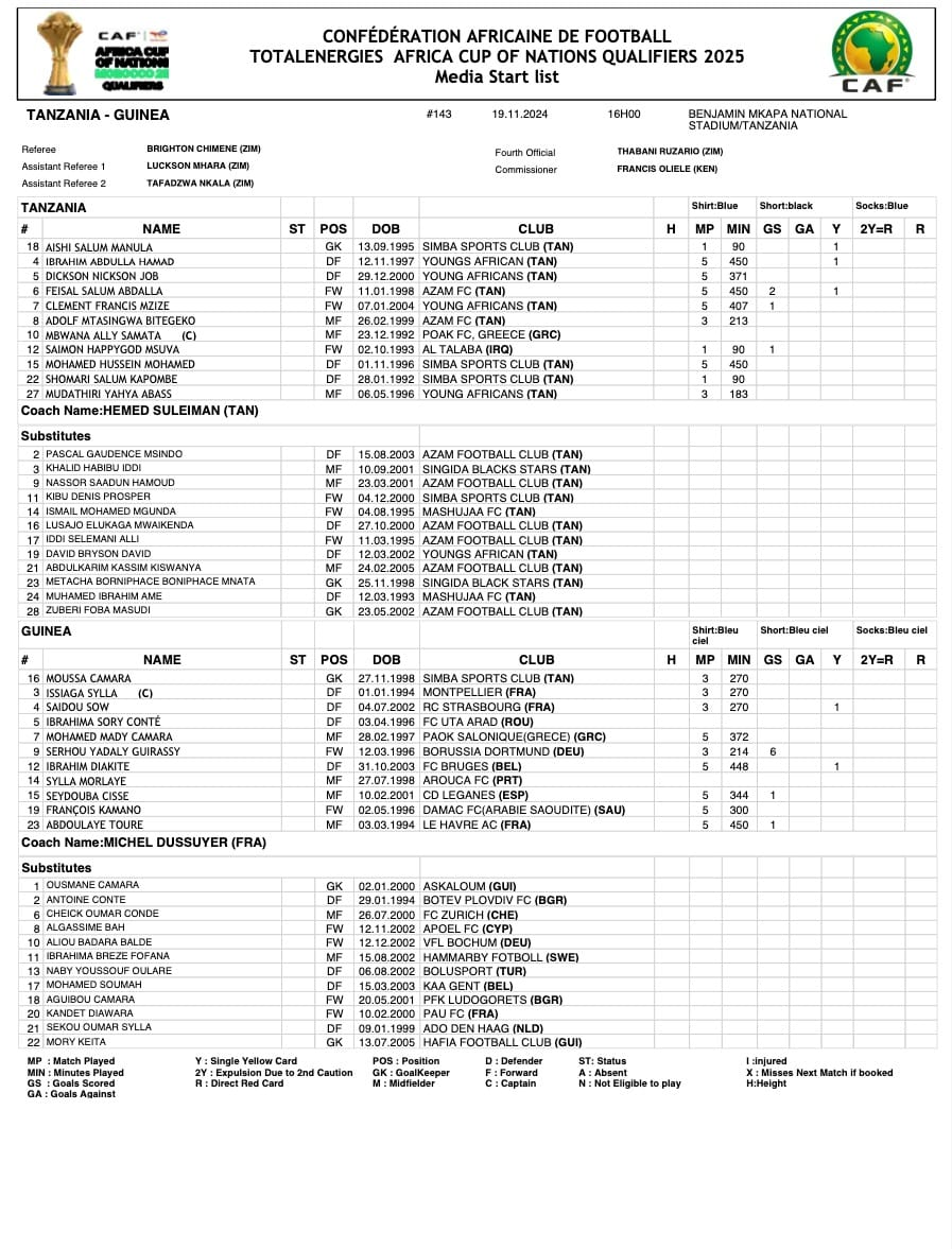 وأدعى منتخب غينيا مشاركة لاعب تنزاني يحمل القميص رقم 26 في الدقيقة 73 من عمر اللقاء دون إدراج اسمه في قائمة المباراة المعتمدة من كاف.