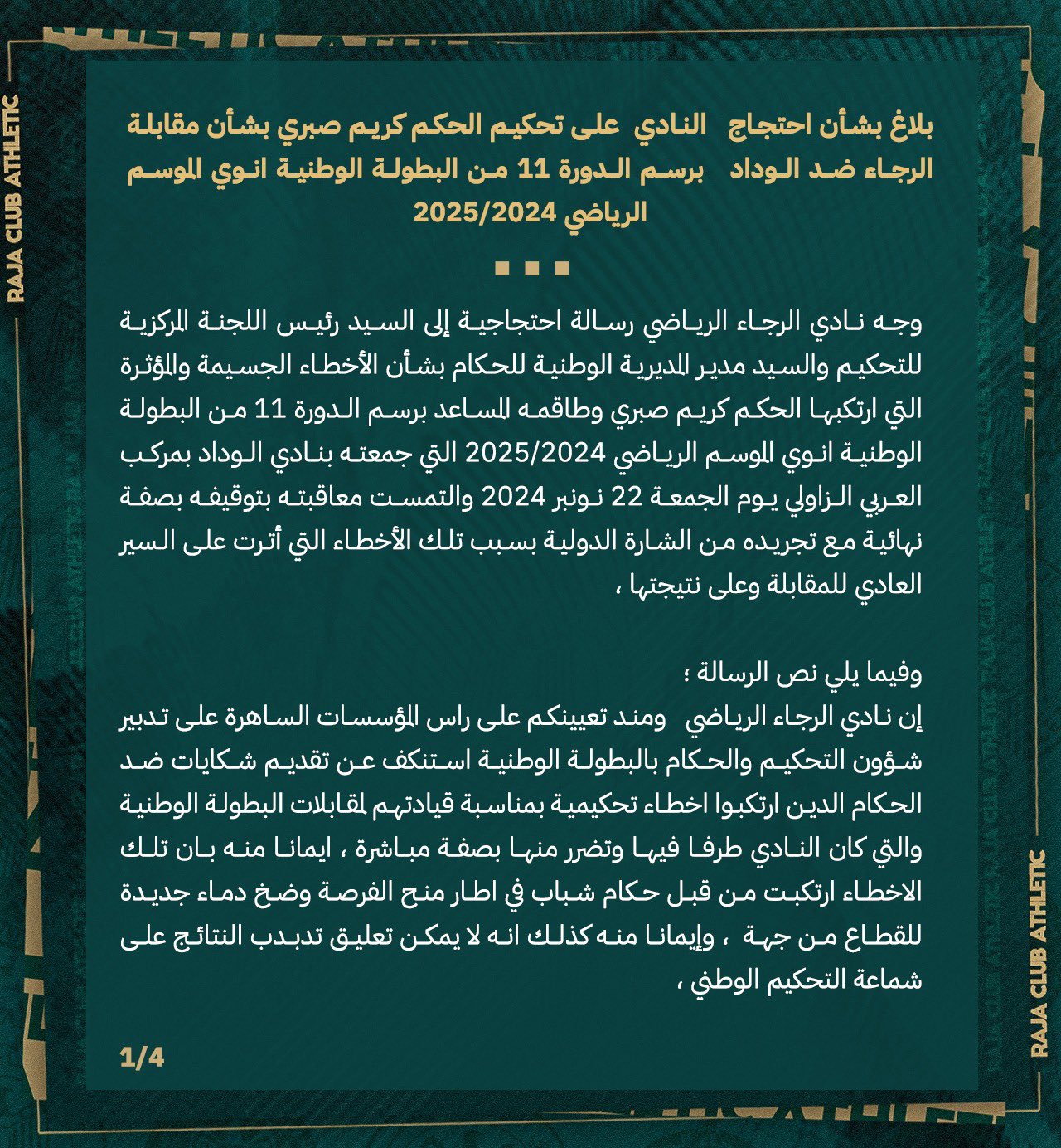 وجّه نادي الرجاء رسالة احتجاج قوية لاتحاد كرة القدم وللجنة الحكام ضد الحكم كريم صبري الذي أدار مباراة "الديربي"، أمس الجمعة، بين الرجاء والوداد لحساب الجولة 11 من الدوري المغربي للمحترفين.