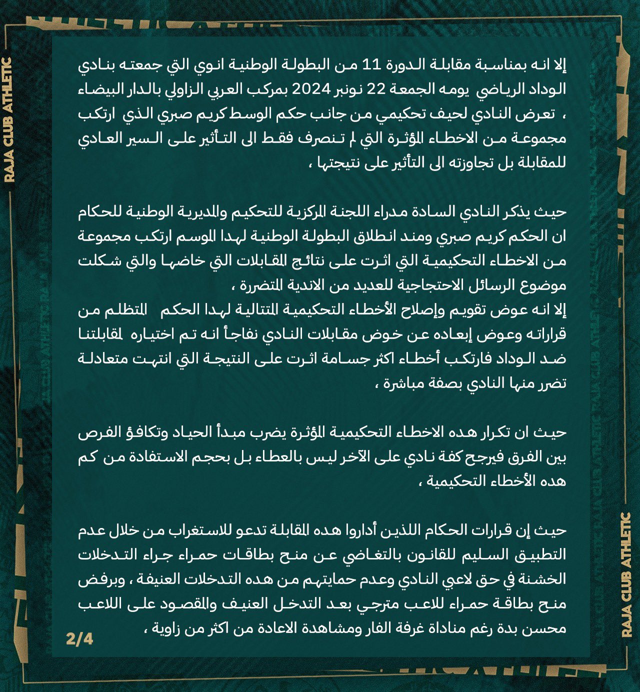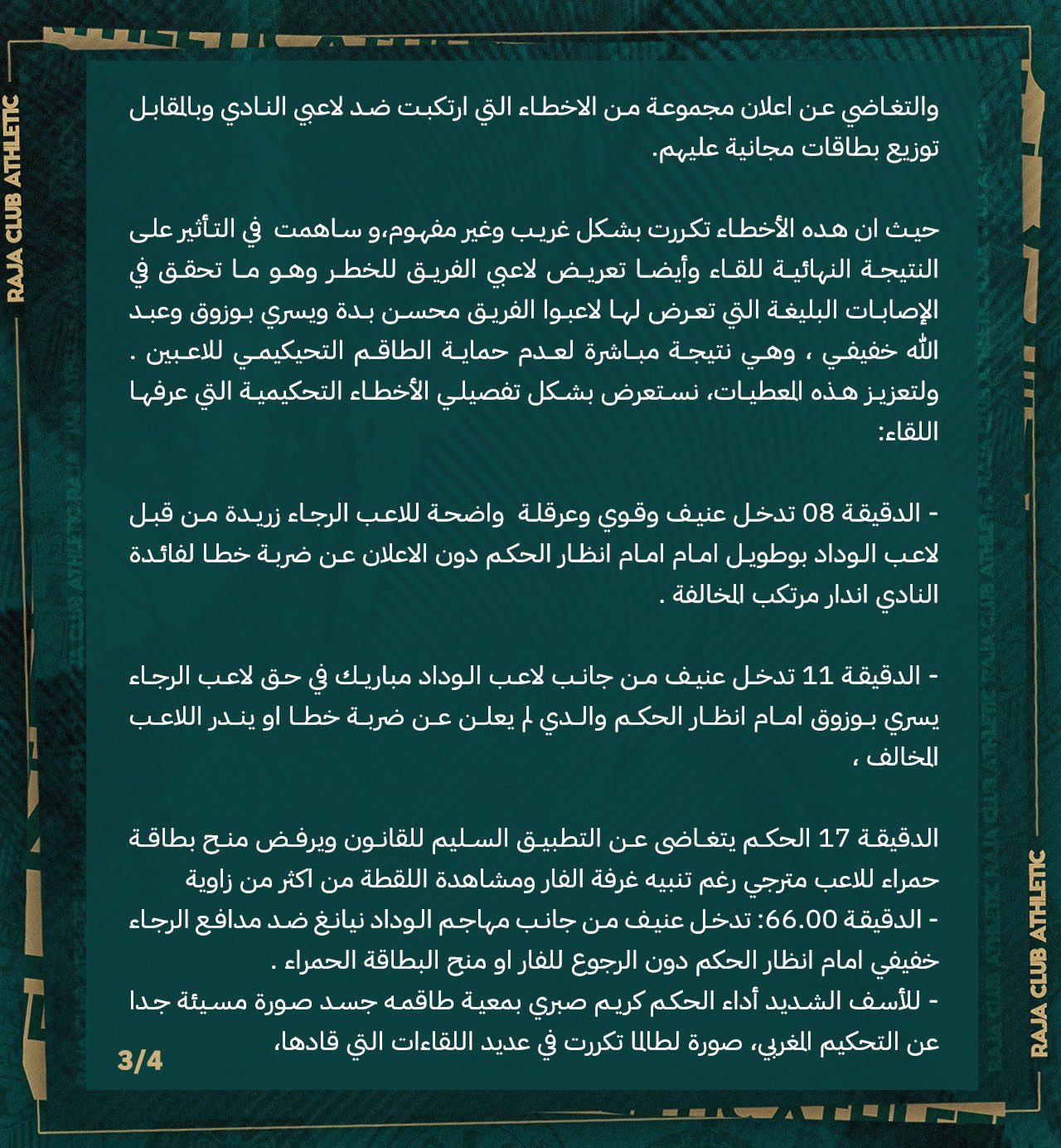 ونشر الحساب الرسمي لنادي الرجاء على منصة "إكس" مجموعة من اللقطات التحكيمية المثيرة للجدل والتي تضرر منها الفريق، حسب البيان.
