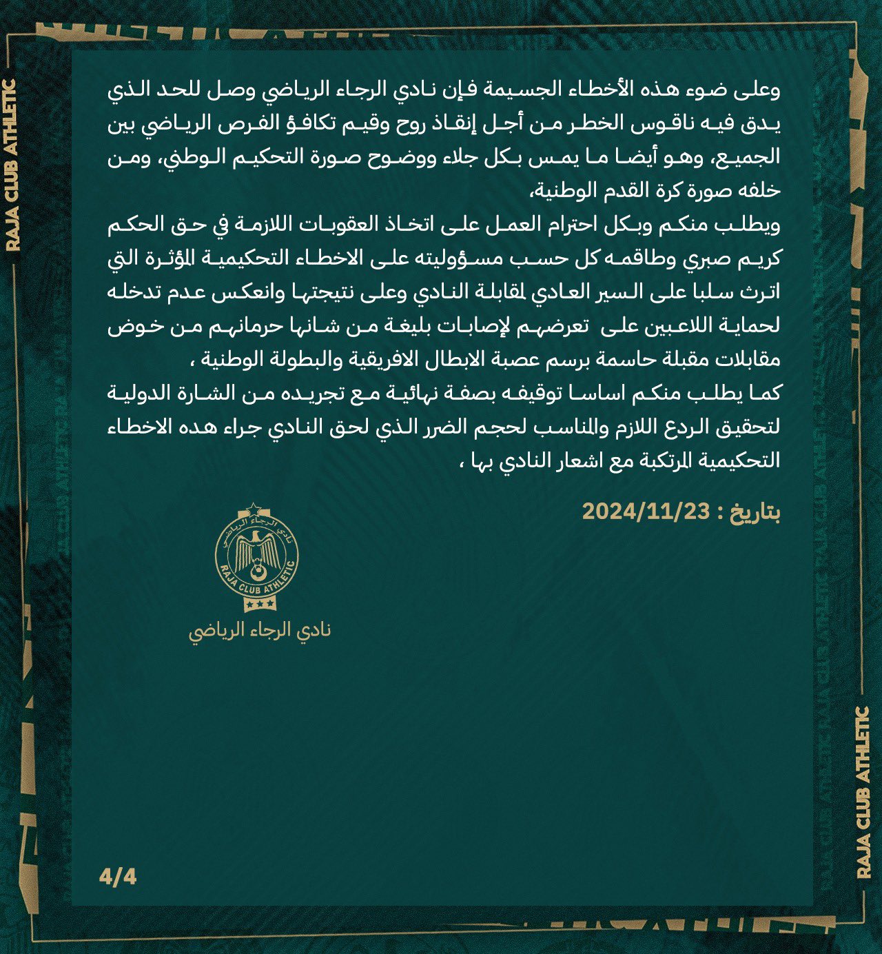 واعتبرت إدارة الرجاء، وفق بيان غاضب، نشرته على حسابها على منصة "إكس" أن الحكم كريم صبري ارتكب الكثير من الأخطاء الفادحة في حق الفريق مطالبة اتحاد الكرة المغربي بتجميده نهائيا وسحب الشارة الدولية منه.