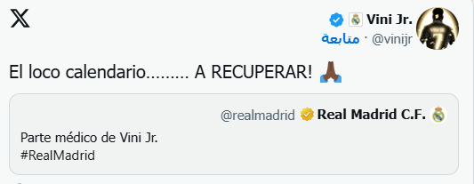 وكتب فينيسيوس تغريدة عبر صفحته الرسمية على موقع التواصل الاجتماعي "إكس": "التقويم المجنون، هيا بنا لنتعافى".
