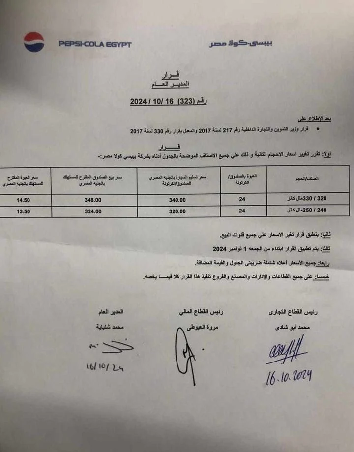 قررت رفع سعر عبوة بيبسي بلاستيك وزن 390 / 400 مل إلى 11.5 جنيه للمستهلك، على أن يباع الصندوق الذي يحتوي على 12 عبوة بسعر 130 جنيها تسليم السيارة للمحال التجارية، و138 جنيهًا سعر بيع الصندوق للمستهلك.