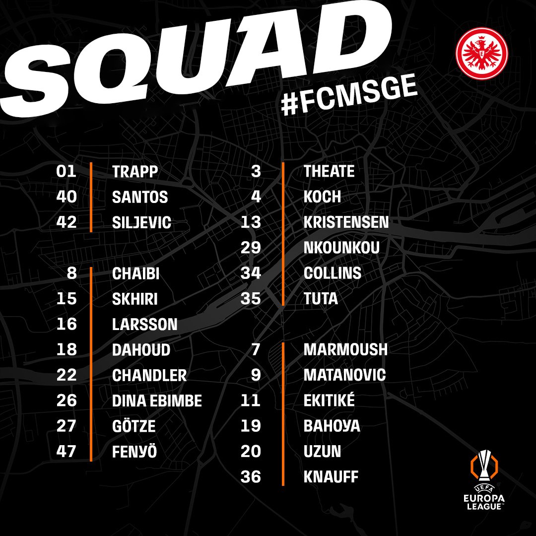 أعلن المدرب دينو توبمولر المدير الفني لفريق آينتراخت فرانكفورت، القائمة التي سيخوض بها المباراة المقبلة أمام نظيره ميتيلاند الدنماركي، في إطار مواجهات الجولة الخامسة من مسابقة الدوري الأوروبي.