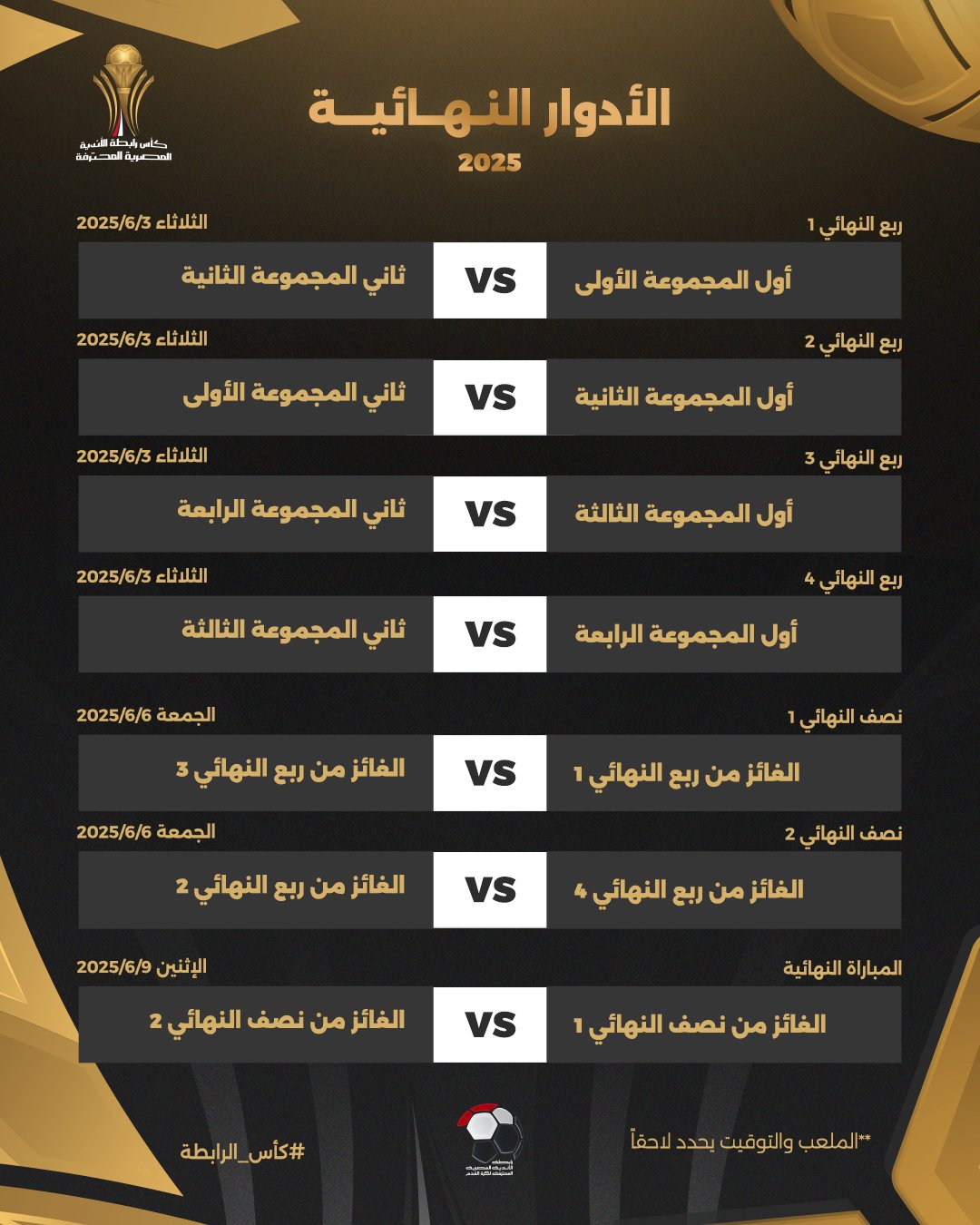 وستقام مباريات ربع النهائي يوم 3 يونيو، فيما تقام مباراتي نصف النهائي يوم 6 يونيو، وتختتم منافسات البطولة بالنهائي يوم 9 يونيو 2025.