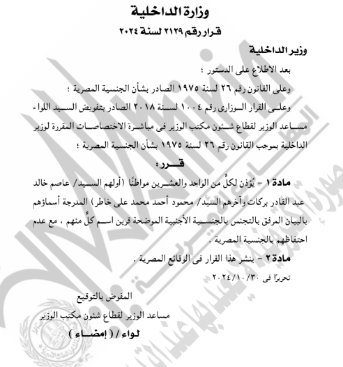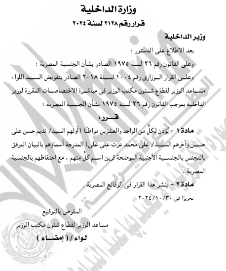 صدر القرار بعد الاطلاع على الدستور، وعلى القانون رقم 26 لسنة 1975 الصادر بشأن الجنسية المصرية، وعلى القرار الوزارى رقم 1004 لسنة 2018 الصادر بتفويض اللواء مساعد الوزير لقطاع شئون مكتب الوزير في مباشرة الاختصاصات المقررة لوزير الداخلية بموجب القانون رقم 26 لسنة 1975 بشأن الجنسية المصرية.