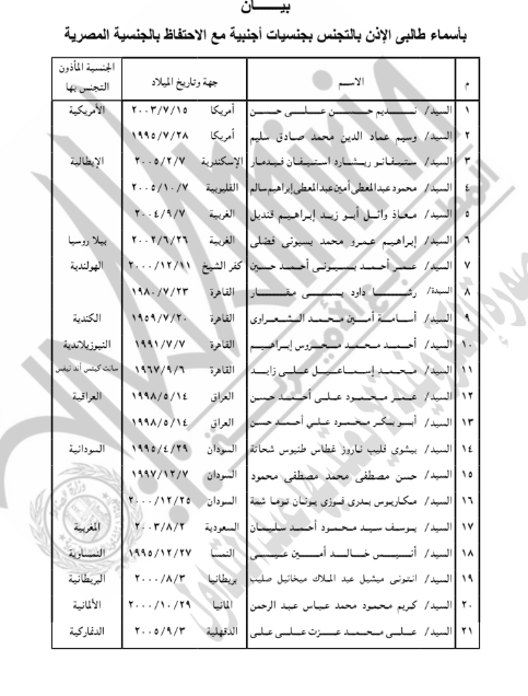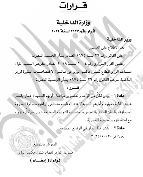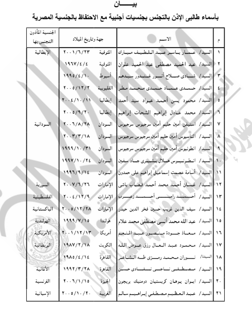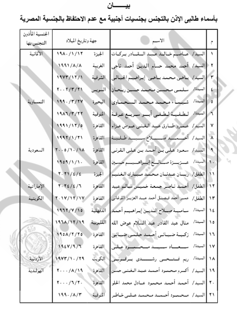 نشرت الجريدة الرسمية، قرار وزارة الداخلية بحصول 63 شخصًا على جنسيات أجنبية، مرفق أسماؤهم في الكشوف التالية.