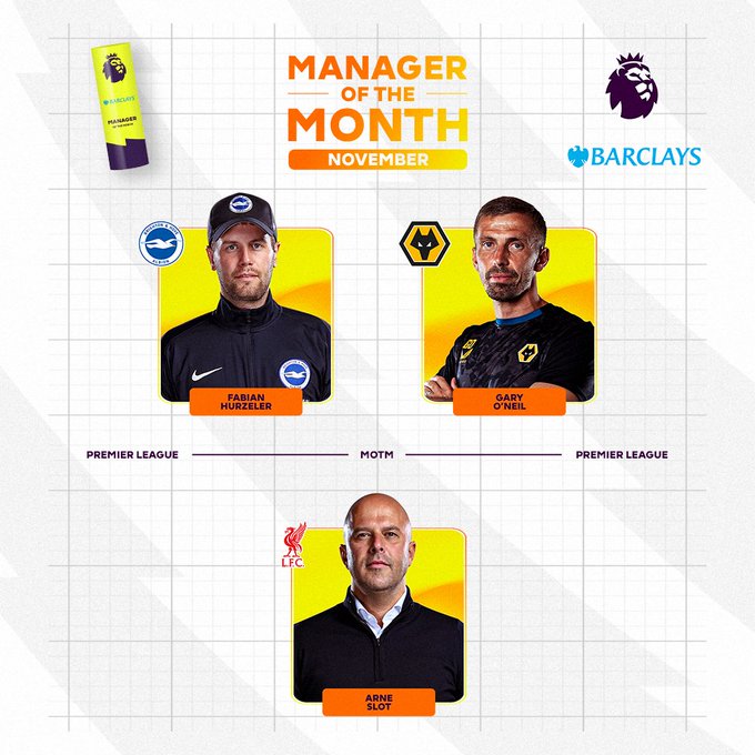 أعلنت رابطة الدوري الإنجليزي الممتاز، قائمة المدربين المرشحين لجائزة الأفضل في البريمرليج عن شهر نوفمبر الماضي.