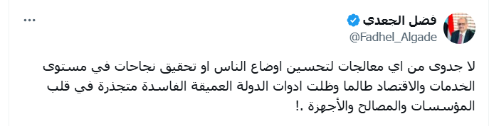 وأشار في منشور على حسابه في منصة فيسبوك، إلى أن السبب هو بقاء أدوات الدولة العميقة الفاسدة متجذرة في قلب المؤسسات والمصالح والأجهزة.
