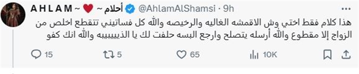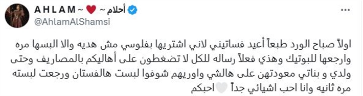 وكتبت أحلام على حسابها بموقع "X": "طبعا أعيد فساتيني لأني اشتريها بفلوسي مش هدية وإلا ألبسها مرة وأرجعها للبوتيك، وهذه فعلا رسالة للكل لا تضغطون على أهاليكم بالمصاريف، وحتى ولدي وبناتي معودتهن على هالشي وأوريهم شوفوا لبست هالفستان ورجعت لبسته مرة ثانية وأنا أحب أشيائي جدا".