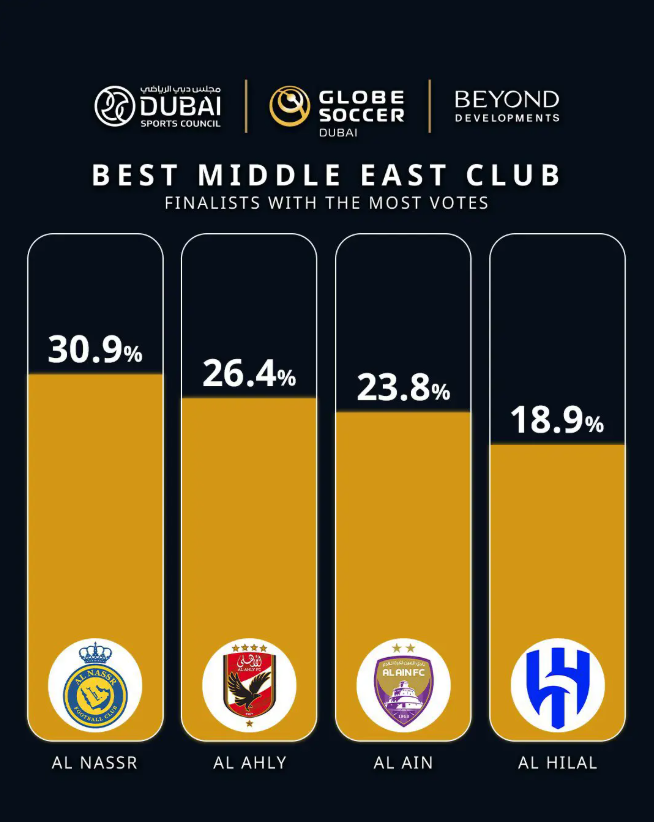 ويأتي الأهلي حاليًا في المرتبة الثانية، بنسبة 26.4% بسباق أفضل نادٍ في الشرق الأوسط، خلف النصر السعودي صاحب الصدارة، بنسبة 30.9%، بينما يأتي ثالثًا العين الإماراتي بنسبة 23.8%، والهلال رابعًا بنسبة 18.9%.