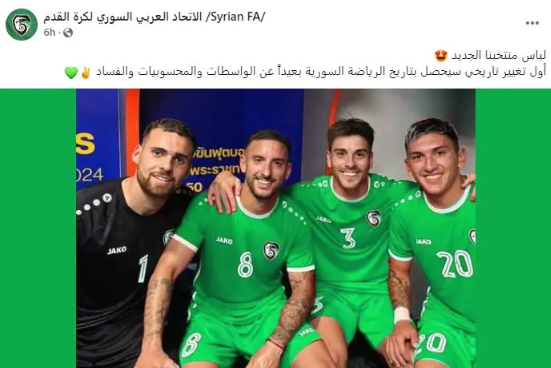 وقال الاتحاد السوري في البيان: "لباس منتخبنا الجديد.. أول تغيير تاريخي سيحصل بتاريخ الرياضة السورية بعيدا عن الوساطات والمحسوبيات والفساد".