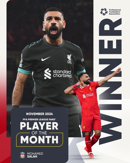 توج النجم المصري محمد صلاح لاعب نادي ليفربول، بجائزة أفضل لاعب في الدوري الإنجليزي خلال شهر نوفمبر، من رابطة اللاعبين المحترفين.