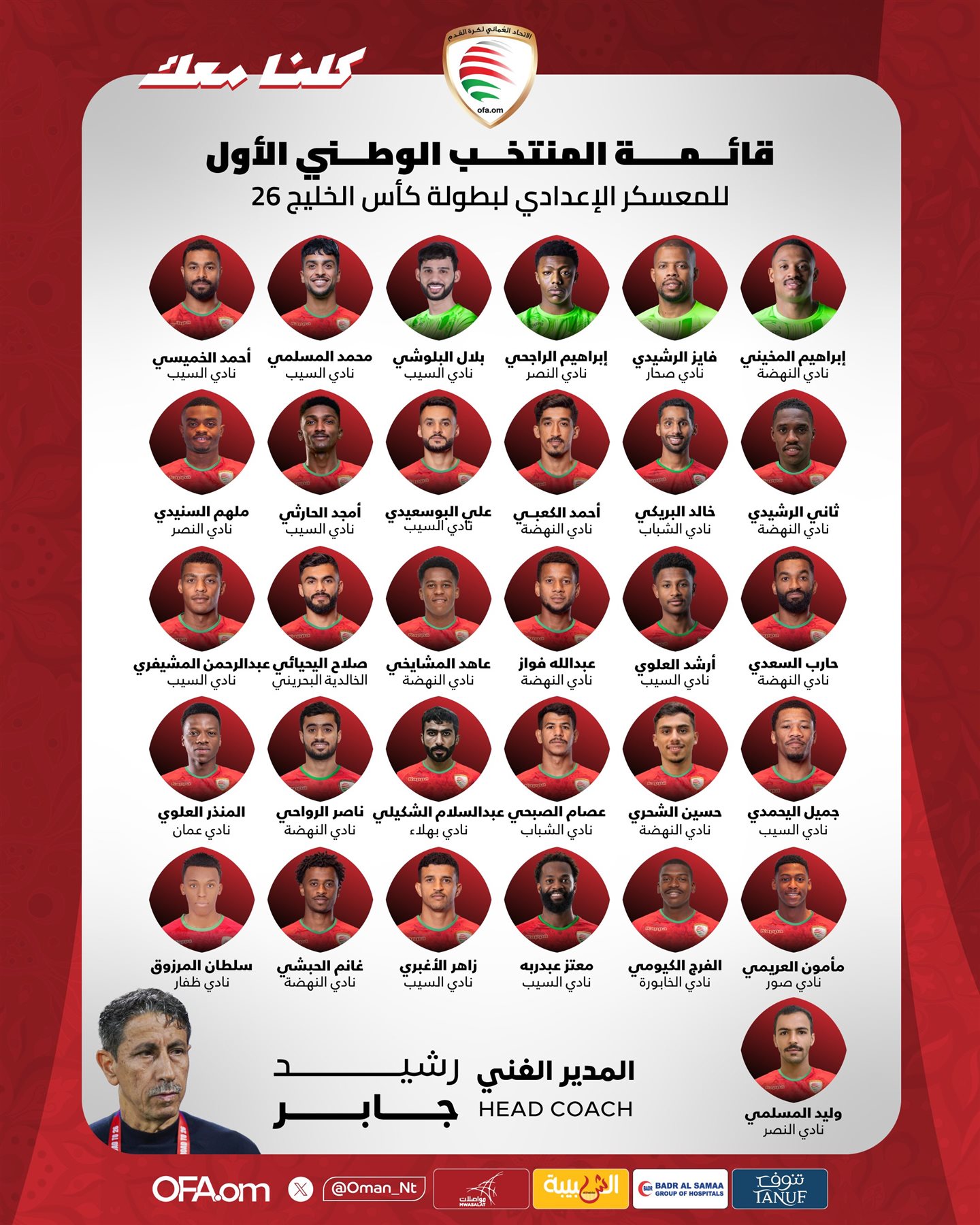 دعا رشيد جابر المدير الفني لمنتخب عُمان، 31 لاعبا للدخول في معسكر إعدادي اليوم الثلاثاء، استعدادا للمشاركة في كأس الخليج لكرة القدم (خليجي 26) التي تستضيفها الكويت من 21 ديسمبر الجاري إلى 3 يناير المقبل.