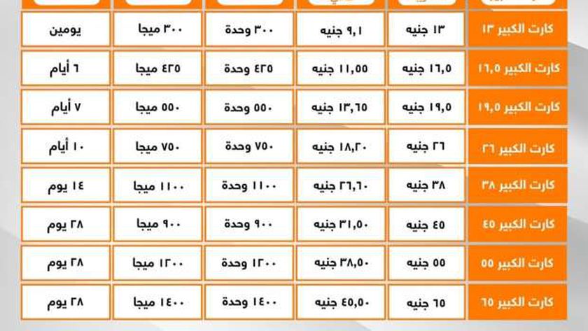 كما قامت "أورنج" بتحديث أسعار "كارت الكبير" بمختلف فئاته، والتي توفر للعميل رصيدًا بوحدات أو ميجابايت، مع فترات صلاحية متفاوتة، وجاءت الأسعار كالتالي: