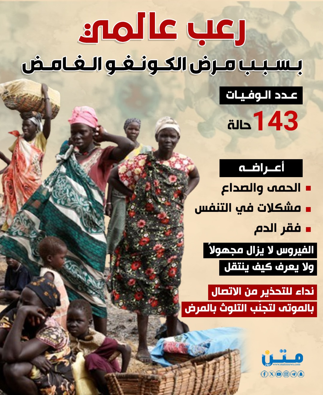 رعب عالمي بسبب مرض الكونغو الغامض (انفوجراف) الأربعاء 11/ديسمبر/2024 - 08:17 م 12/11/2024 8:17:06 PM انفوجراف متن شارك طباعة عدد الوفيات 143 حالةأعراضه* الحمى والصداع* مشكلات في التنفس* فقر الدم* الفيروس لا يزال مجهولًا ولا يعرف كيف ينتقل * نداء للتحذير من الاتصال بالموتى لتجنّب التلوث بالمرض شارك الحمى الكونغو فيروس الموت ألغام وفيات تلوث إنفوجراف