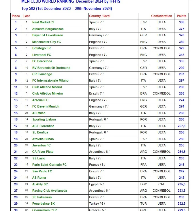 وتصدر نادي ريال مدريد الإسباني التصنيف برصيد 388 نقطة، وجاء أتالانتا الإيطالي ثانيا برصيد 377 نقطة، ثم باير ليفركوزن الألماني ثالثا برصيد 370 نقطة.