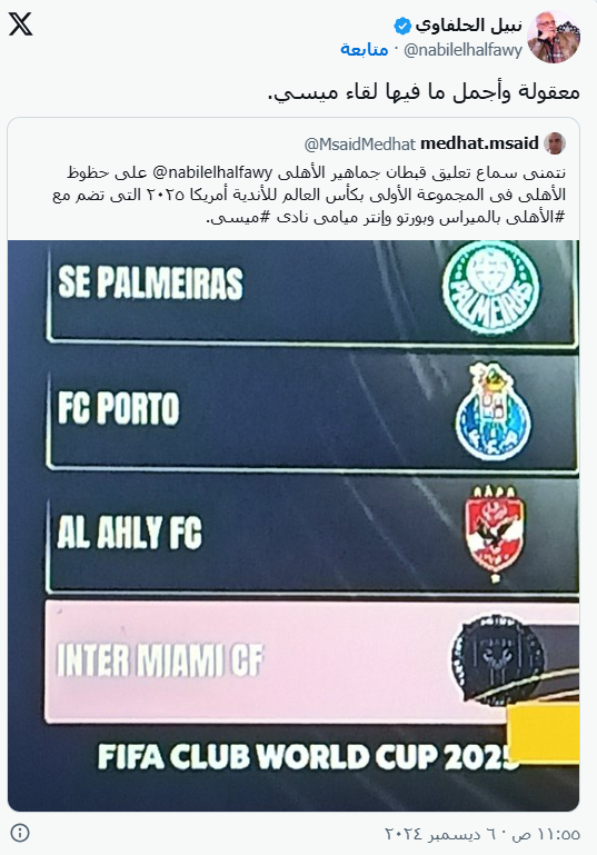 وكانت آخر تغريدة كتبها بنفسه، تخص قرعة كأس العالم للأندية 2025، والتي سيلعب فيها الأهلي مع إنتر ميامي الأمريكي بقيادة النجم الأرجنتيني ليونيل ميسي.
