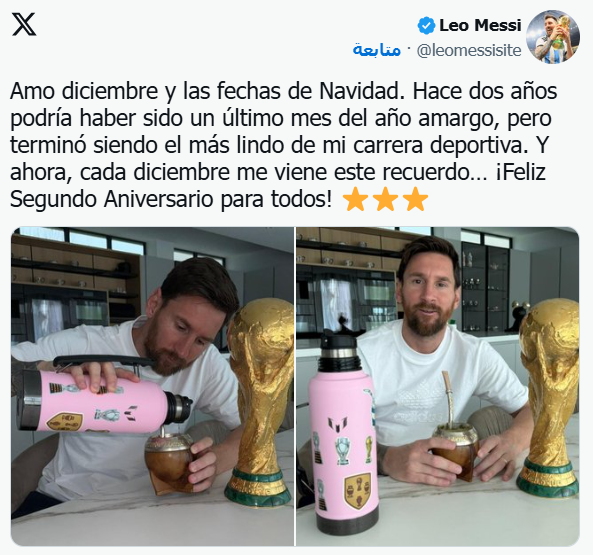 ونشر ميسي صورة له مع كأس العالم على صفحته الرسمية بموقع التدوينات "إكس"، وكتب عليها: "أنا أحب ديسمبر وعيد الميلاد. قبل عامين، كان من الممكن أن يكون الشهر الأخير من العام مريرًا، لكنه انتهى به الأمر ليصبح أجمل شهر في مسيرتي الرياضية".