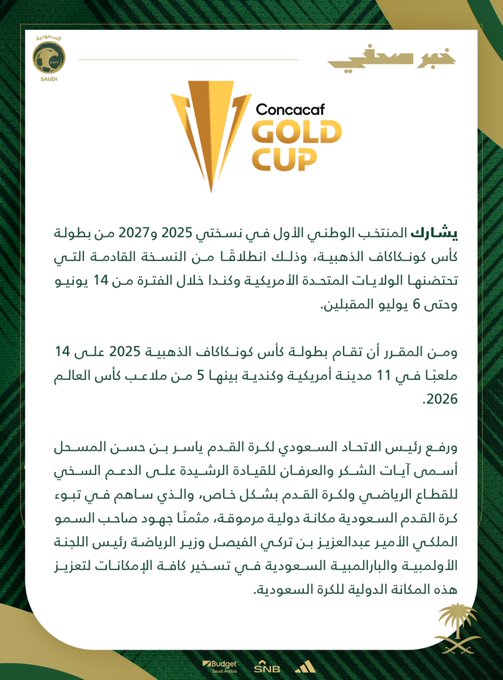 وأصدر الاتحاد السعودي بيانًا قال من خلاله إن "الأخضر" سيشارك في نسختي 2025 و2027، انطلاقًا من النسخة القادمة التي تحتضنها الولايات المتحدة الأمريكية وكندا خلال الفترة من 14 يونيو وحتى 6 يوليو المقبلين.