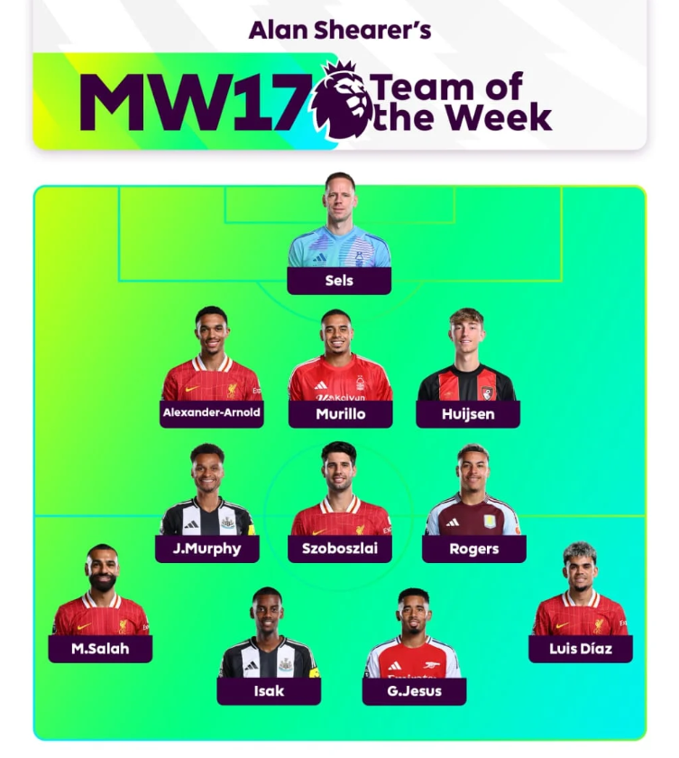 وكشف الموقع الرسمي للدوري الإنجليزي عن اختيارات آلان شيرر للتشكيل المثالي في الدوري الإنجليزي في الجولة 17، وجاءت كالتالي:
