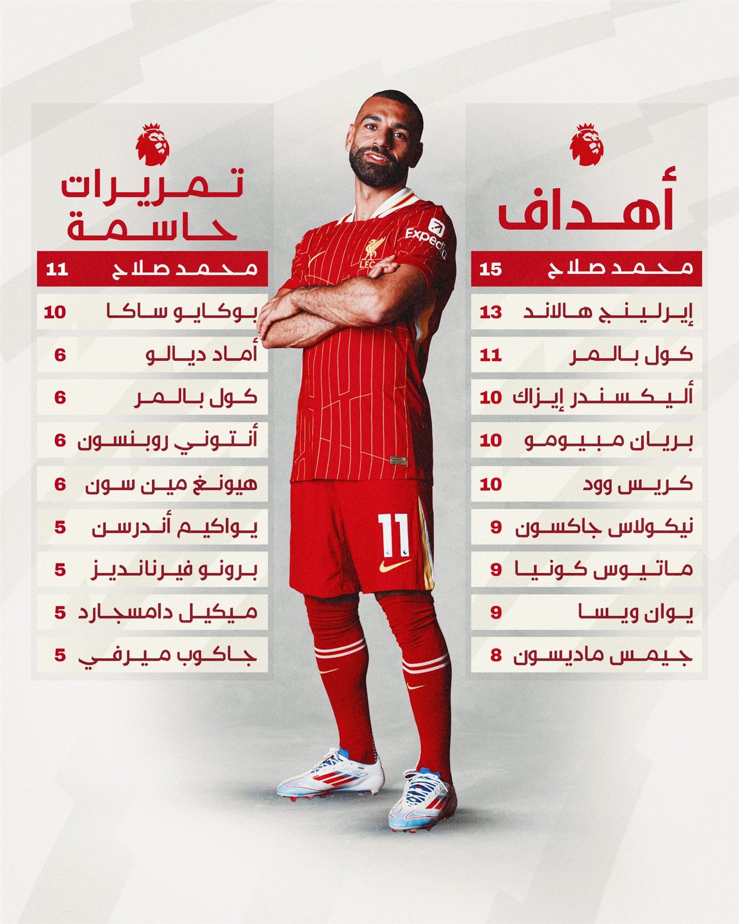 ونشر أهداف صلاح وتمريراته الحاسمة في الموسم الحالي، خاصةً بعد تصدره قائمة الأهداف والتمريرات في الدوري الإنجليزي الممتاز هذا الموسم.