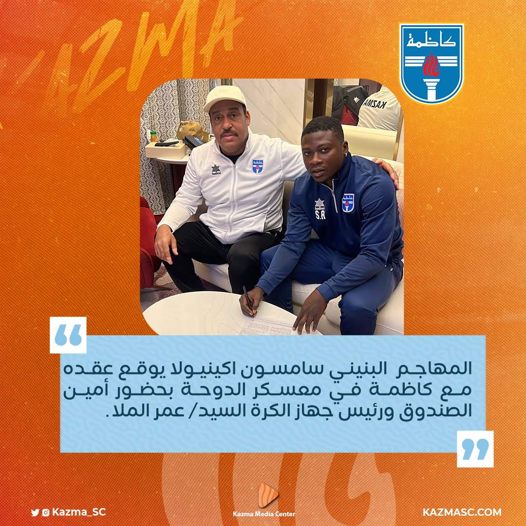 وأضاف: "سامسون يوقع عقده مع كاظمة في معسكر الدوحة بحضور أمين الصندوق ورئيس جهاز الكرة عمر الملا".