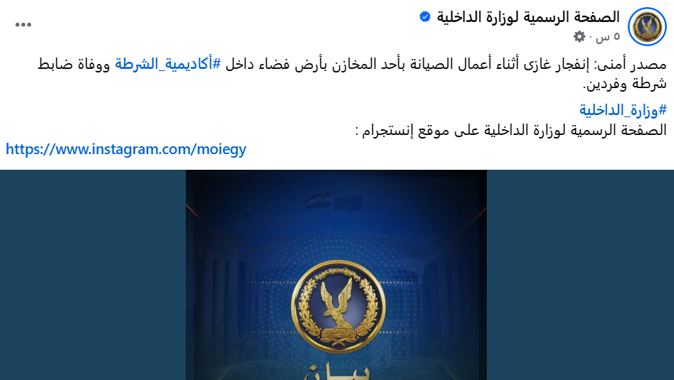 وقالت الوزارة في أول بيان بشأن الانفجارداخل أكاديمية الشرطة إن الانفجار جاء نتيجة غازى أثناء أعمال الصيانة بأحد المخازن بأرض فضاء داخل أكاديمية الشرطة، نتج عنه استشهاد ضابط شرطة وفردين أمن.