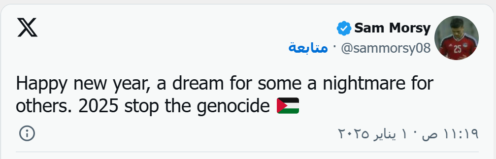 واصل النجم المصري سام مرسي قائد فريق إبسويتش تاون الإنجليزي دعمه للقضية الفلسطينية، وذلك عند التهنئة بالعام الجديد.