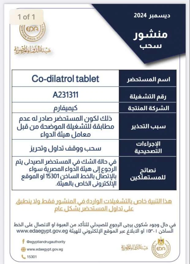 وافقت هيئة الدواء المصرية على سحب ووقف وتداول مستحضر «Co-dilatrol tablet» من الصيدليات بناء على معلومات من الشركة المنتجة، لعدم مطابقة المستحضر للمواصفات المقررة.