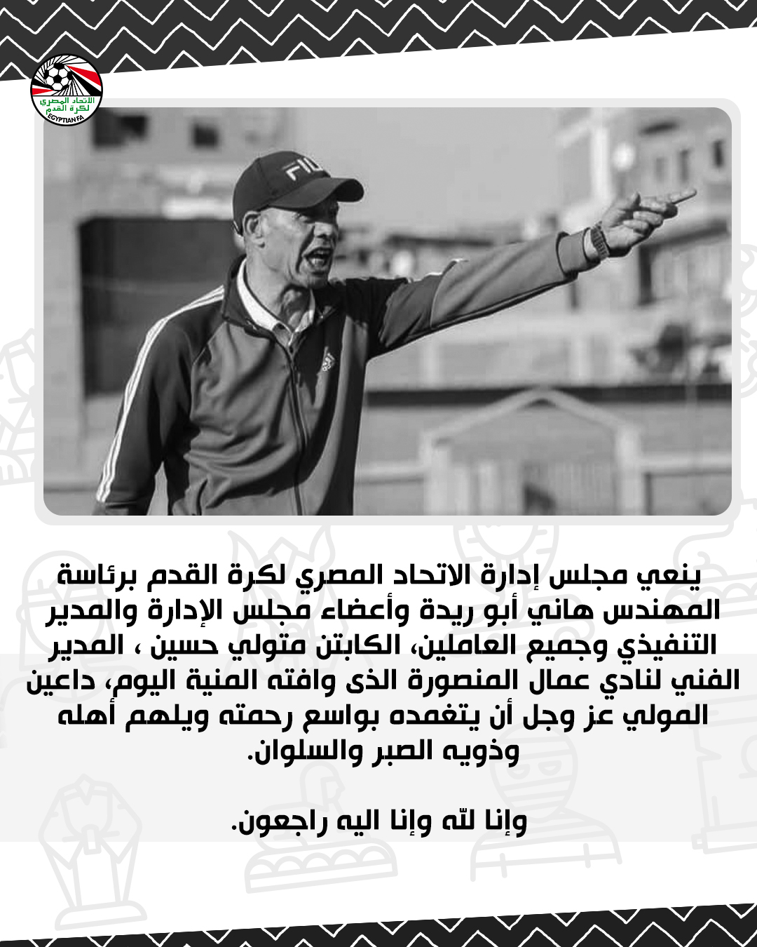 واتحاد الكرة المصري في بيان: "مجلس إدارة الاتحاد المصري لكرة القدم برئاسة هاني أبو ريدة ينعى متولي حسين، المدير الفني لنادي عمال المنصورة الذي وافته المنية اليوم، داعين المولي عز وجل أن يتغمده بواسع رحمته ويلهم أهله وذويه الصبر والسلوان".