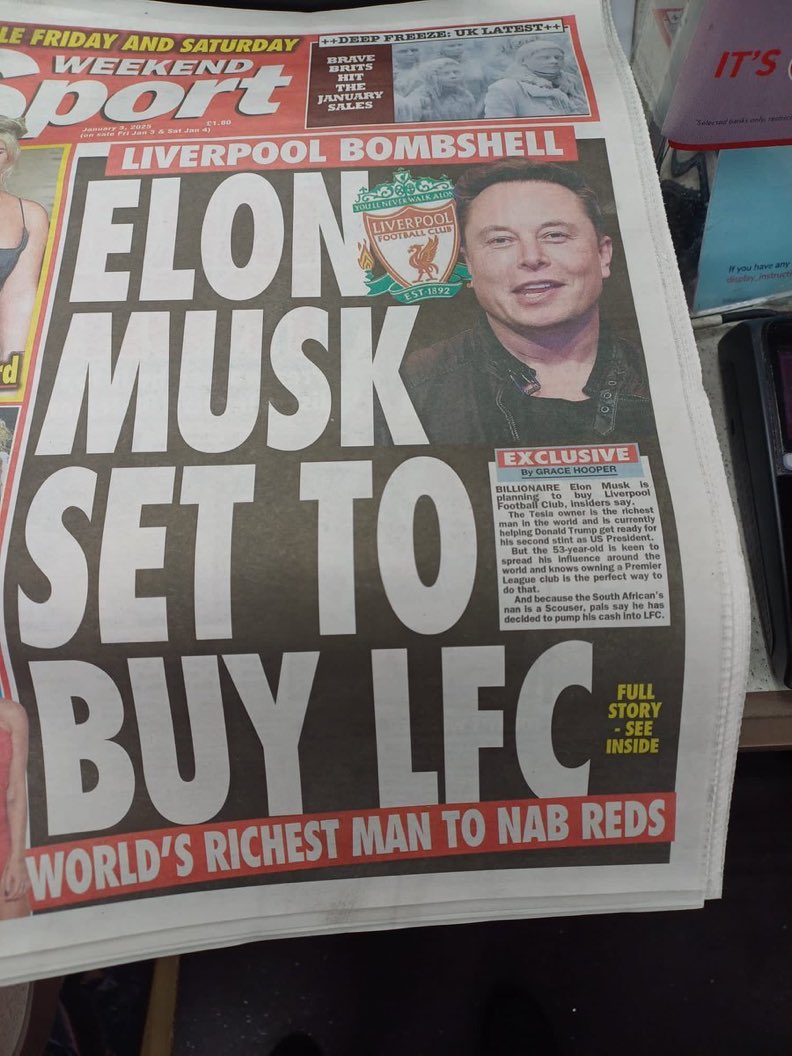 وبحسب صحيفة Weekend Sport الإنجليزية، فقد أظهر إيلون ماسك الذي تقدر ثروته بـ421.2 مليار دولار اهتمامه بشراء نادي ليفربول الإنجليزي.