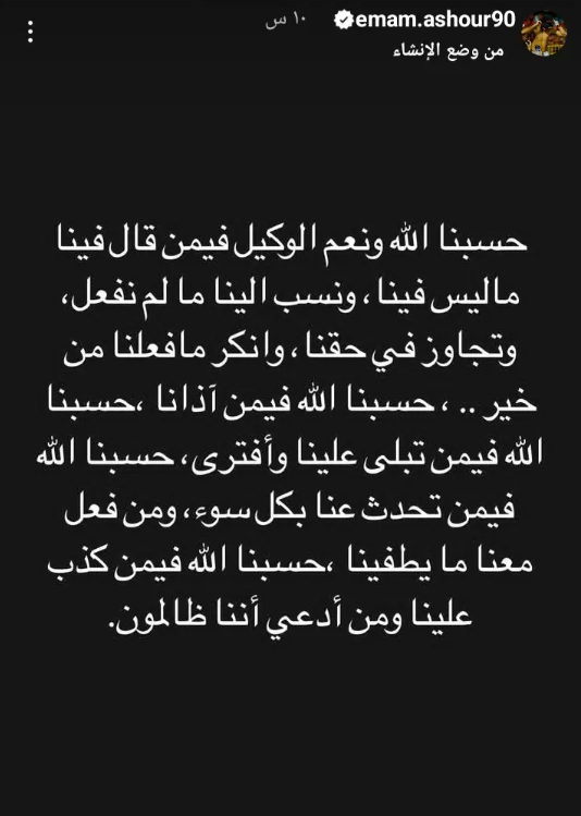 وكتب عاشور في تعليقه عبر خاصية "الستوري": "حسبنا الله ونعم الوكيل فيمن قال فينا، ما ليس فينا ونسب إلينا ما لم نفعله، وتجاوز في حقنا وأنكر ما فعلنا من خير".