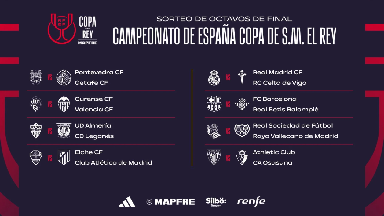وأسفرت قرعة الدور ثمن النهائي من بطولة كأس ملك إسبانيا، عن وقوع فريق ريال مدريد وجهًا لوجه أمام سيلتا فيجو وبرشلونة ضد ريال بيتيس.