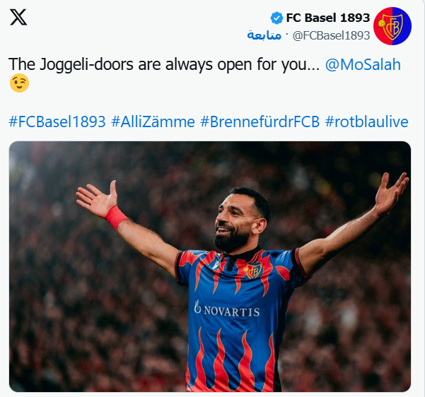 ونشر حساب نادي بازل عبر حسابه على منصة "إكس" صورة لـ محمد صلاح بقميص النادي، خلال احتفاله بأحد الأهداف، وعلق عليها: «أبوابنا مفتوحة لك دائما».