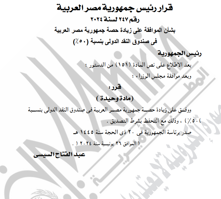نشرت الجريدة الرسمية قرار الرئيس المصري عبد الفتاح السيسي، رئيس الجمهورية، رقم 247 لسنة 2024، بشأن الموافقة على زيادة حصة جمهورية مصر العربية في صندوق النقد الدولي بنسبة 50%، وذلك مع التحفظ بشرط التصديق.