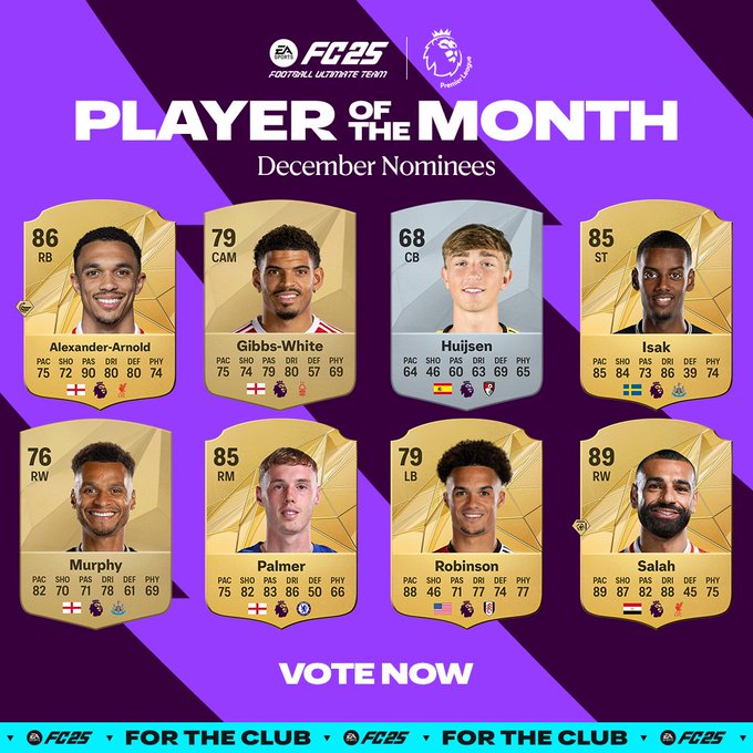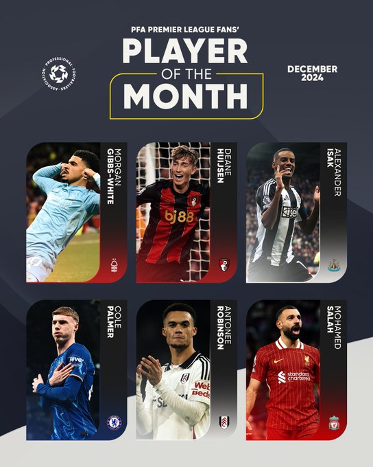 المرشحون لجائزة أفضل لاعب في الدوري الإنجليزي من رابطة المسابقة خلال شهر ديسمبر هم: