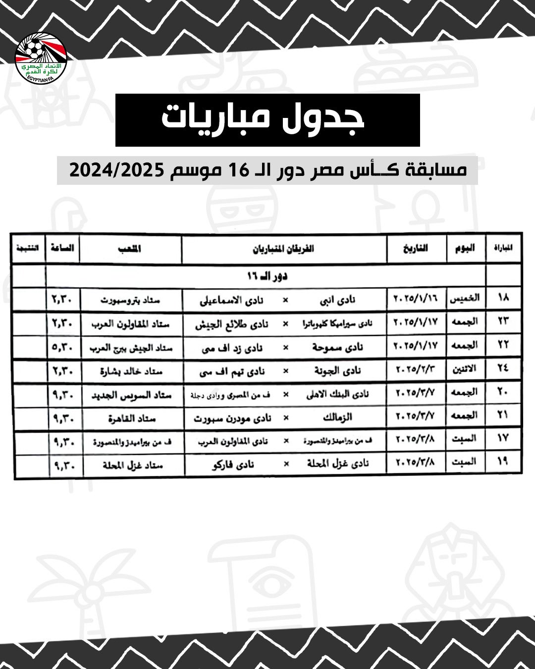 أعلن الاتحاد المصري لكرة القدم مواعيد مباريات دور الـ16 من بطولة كأس مصر للموسم الجاري 2024/2025.