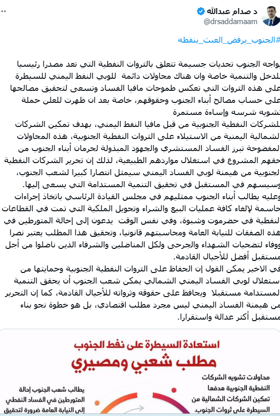 للشركات النفطية الجنوبية من قبل مافيا النفط اليمني، بهدف تمكين الشركات الشمالية اليمنية من الاستيلاء على الثروات النفطية الجنوبية، هذه المحاولات المفضوحة تبرز الفساد المستشري والجهود المبذولة لحرمان أبناء الجنوب من حقهم المشروع في استغلال مواردهم الطبيعية، لذلك إن تحرير الشركات النفطية الجنوبية من هيمنة لوبي الفساد اليمني سيمثل انتصارا كبيرا لشعب الجنوب، وسيسهم في المستقبل في تحقيق التنمية المستدامة التي يسعى إليها".