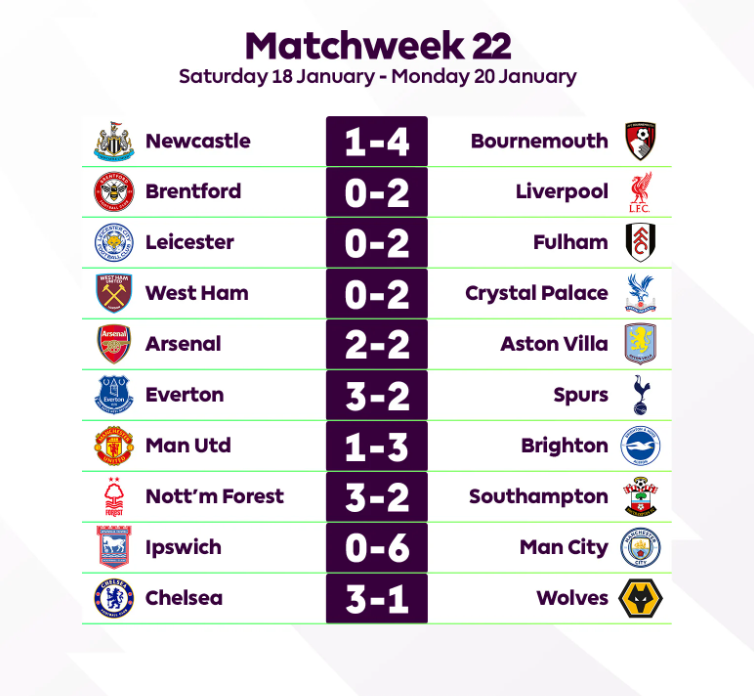 أسدل الستار مساء أمس الاثنين، على منافسات الجولة 22 من بطولة الدوري الإنجليزي الممتاز "البريمرليج".