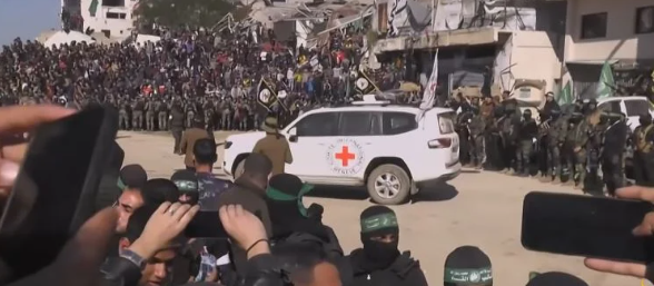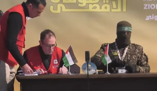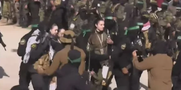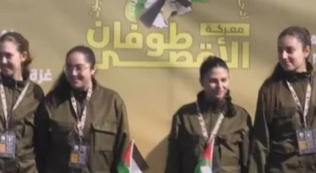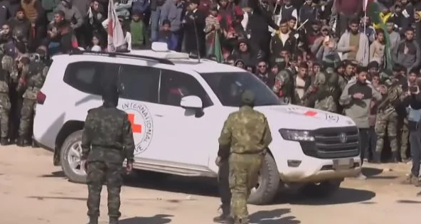 تسلمت وفد الصليب الأحمر، الرهينات الإسرائيليات الأربع من حماس، وهن يرتدين الزى العسكرى الخاص بجيش الاحتلال الإسرائيلي، وذلك ضمن الاتفاق المبرم بين الفصائل الفلسطينية والاحتلال الإسرائيلي.