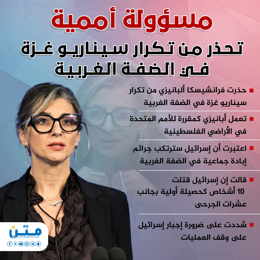 - حذرت فرانشيسكا ألبانيزي من تكرار سيناريو غزة في الضفة الغربية
