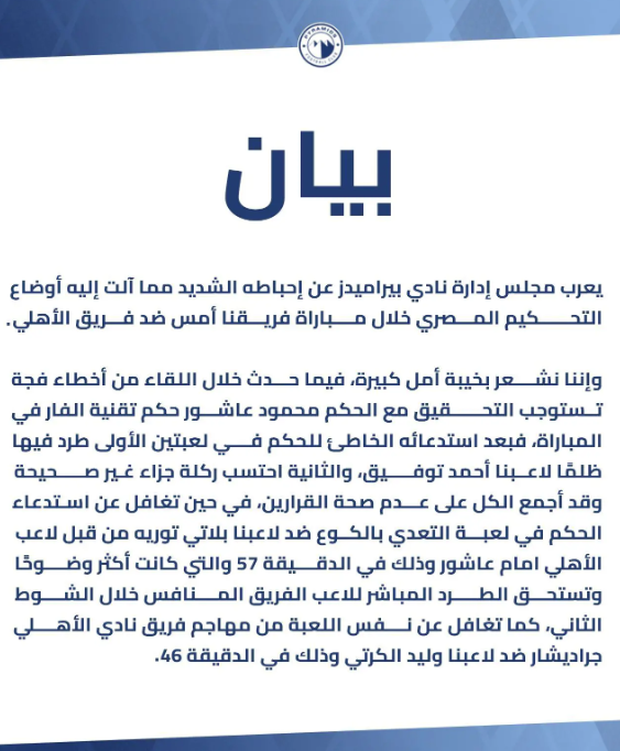 وأتم مجلس بيراميدز بيانه مطالبًا الاتحاد المصري بسرعة إيجاد حلول لمشكلة التحكيم المتراكمة من سنوات بما يضمن تحقيق العدالة والمساواة لجميع الأندية المتنافسة.